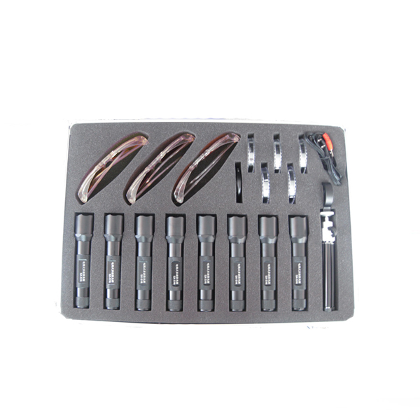 產品配件:手電筒八支、充電器一個、濾鏡七片、眼鏡三副、三腳架一個、高檔鋁盒一個